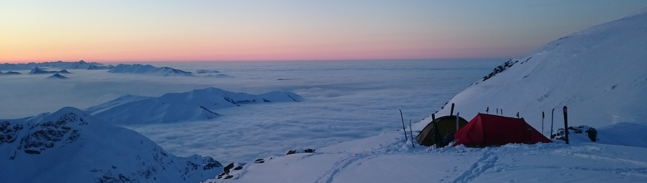 Bivouac grandiose à 2200m, toujours au dessus de la mer de nuage. -10°C la nuit sous la tente. Ascension le lendemain du Montaigu en piolet crampon, nous arrêtons à 20m du sommet, la corniche n’inspire pas confiance. A la descente, poudreuse légère à volonté ! Quelques virages bien sympa puis nous repeautons pour rejoindre nos traces de la veille.