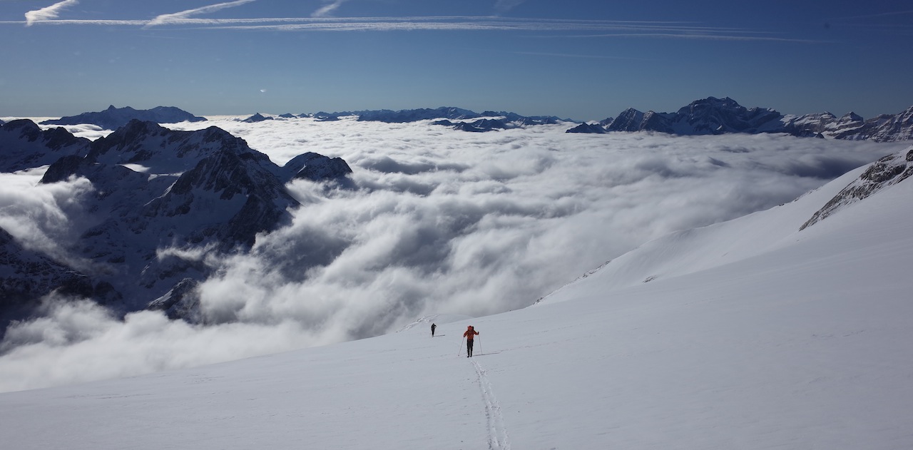 Départ à 4h30, cheminement aisé dans la vallée qui monte progressivement. Nous chaussons vers 2400m, légère poudreuse tombée dans la nuit, mer de nuage dessous, grand soleil et le vent crée des tourbillons de neige qui évoluent autour de nous.