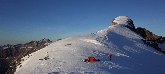 Neige insuffisante pour le ski de rando, ce sera donc de l’alpi en piolet crampons. Direction les crêtes du cirque de Troumouse que nous abordons proche de son extrémité, au Pene Blanque. De là nous suivons le fil de l’arête, souvent aérienne, jusqu’au Petit Pic Blanc. Entre temps, nous bivouaquons au col Paget Chapelle à 3031m.
